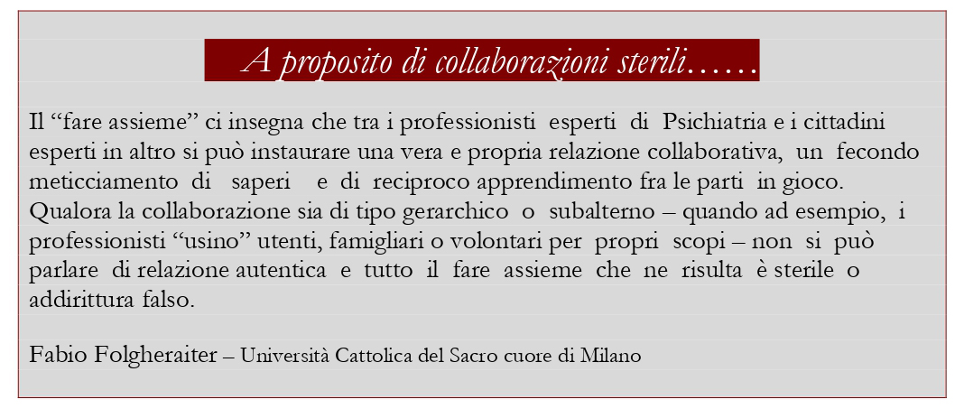 Il "fare assieme" ci insegna che tra i professionisti esperti di Psichiatria e i cittadini esperti in altro si può instaurare una vera e propria relazione collaborativa, un fecondo meticciamento di saperi e di reciproco apprendimento fra le parti in gioco.